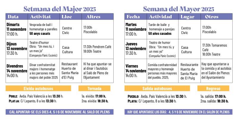 La Pobla de Farnals celebrará el 11, 13 y 14 de noviembre la Semana del Mayor 2025, una iniciativa organizada por la concejalÃa de Bienestar Social para rendir homenaje a las personas mayores del municipio.