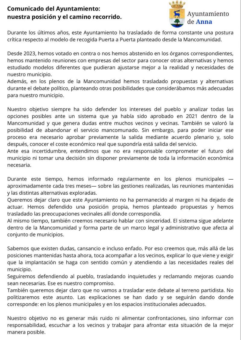 Comunicado del Ayuntamiento sobre el Puerta a Puerta./ EPDAEl Ayuntamiento de Anna ha reiterado su postura crítica respecto al sistema de recogida de residuos