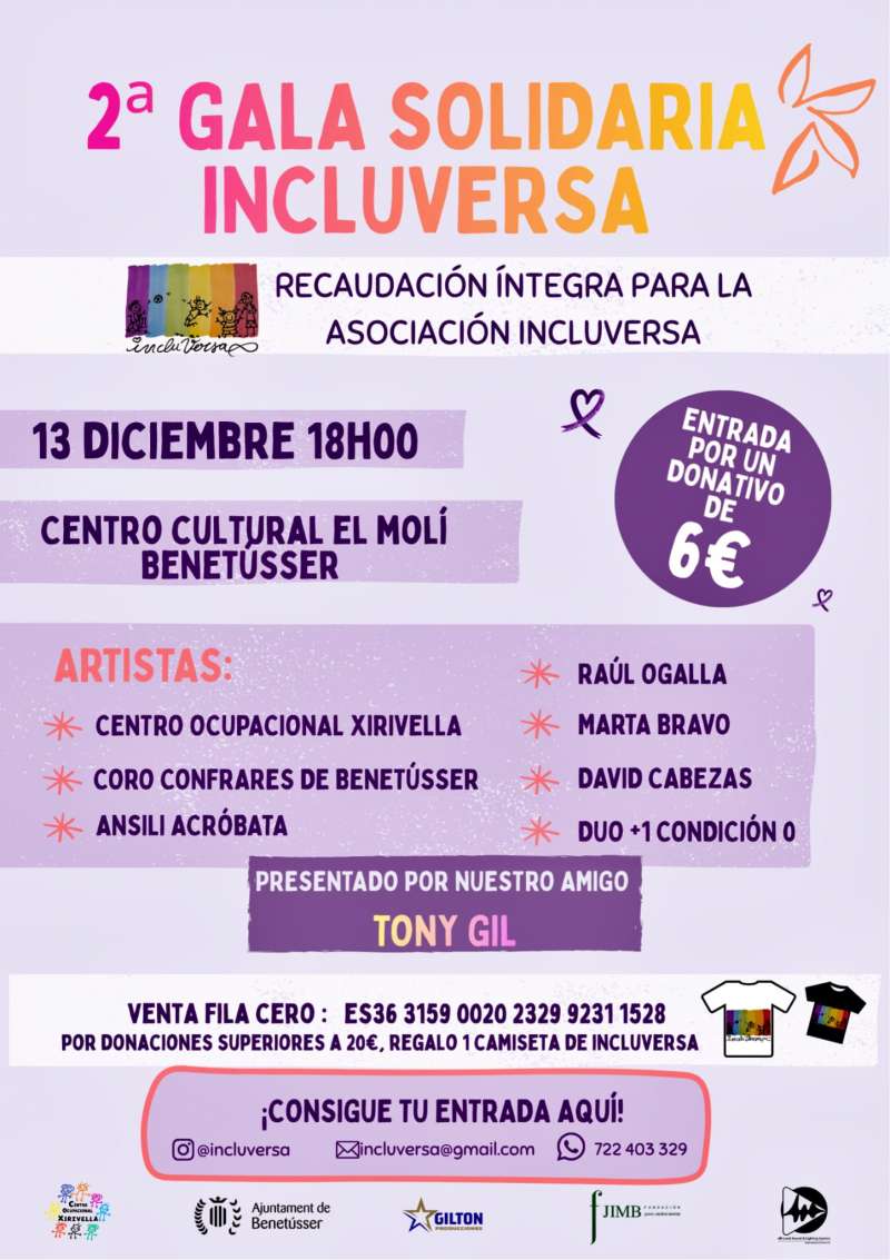 El próximo 13 de diciembre a las 18:00 horas, el Centro Cultural El Molí de Benetússer será el escenario de la 2ª Gala Solidaria Incluversa, un evento benéfico cuya recaudación íntegra se destinará a la Asociación Incluversa, dedicada a impulsar la inclusión social y la atención a personas con diversidad funcional.
