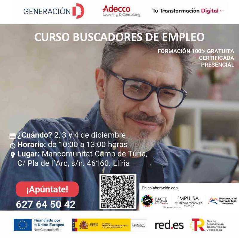 La Mancomunitat Camp de Túria se ha unido a Adecco para poder ofrecer formación certificada. Así, el primero de los cursos que se va a ofrecer a la ciudadanía de Camp de Túria es el relacionado con Buscadores de Empleo.