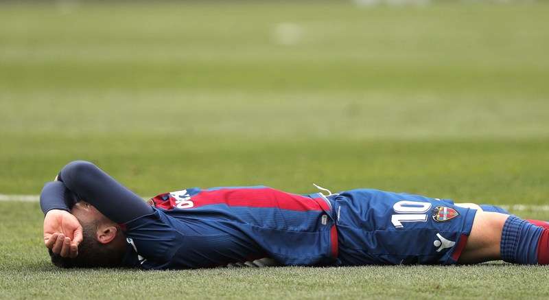 El jugador macedonio del Levante UD Enis Bardhi se lamenta sobre el césped. /EFEEl mediocentro macedonio del Levante Enis Bardhi ha sido condenado a cuatro meses de prisión y una multa de 1.920 euros por conducir por València con un carné falsificado, si bien el juez ha suspendido la ejecución de dicha condena durante dos años, con la condición de que no vuelva a delinquir.