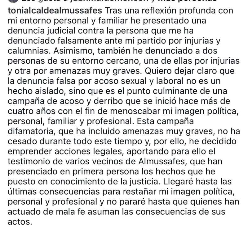 Comunicado compartido en redes sociales esta noche.Pasa a la acción. El alcalde socialista de Almussafes, Toni González, ha anunciado que ha presentado varias denuncias judiciales tras lo que considera una denuncia falsa en su contra y una campaña continuada de acoso personal y político. El propio regidor lo ha hecho público a través de un comunicado difundido en sus redes sociales.