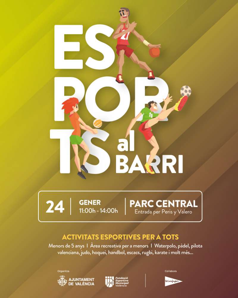 Cartell de la iniciativa "Esports al barri"./EPDALa nova edició del programa ‘Esports al Barri’, impulsat per l'Ajuntament per a promoure la pràctica esportiva des d'edats primerenques, comença dissabte que ve 24 de gener en el Parc Central. En este parc urbà s'habilitaran diferents espais perquè les famílies coneguen les possibilitats que oferix la Fundació Esportiva Municipal en totes les seues instal·lacions repartides pels diferents barris de la ciutat.