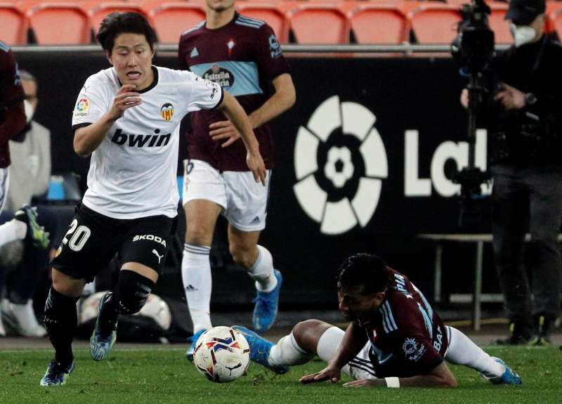 El ya exjugador del Valencia, Lee Kang-in, pelea por el balón con el del Celta, Renato Tapia (d), durante un partido de LaLiga Santander. EFE/Archivo