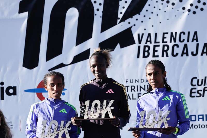 La atleta keniana Helen Ekale (c) celebra en el podio después de proclamarse vencedora en la categoría femenin en la 17ª edición de la 10K Valencia Ibercaja by Kipruny de 2025. EFE/ Archivo