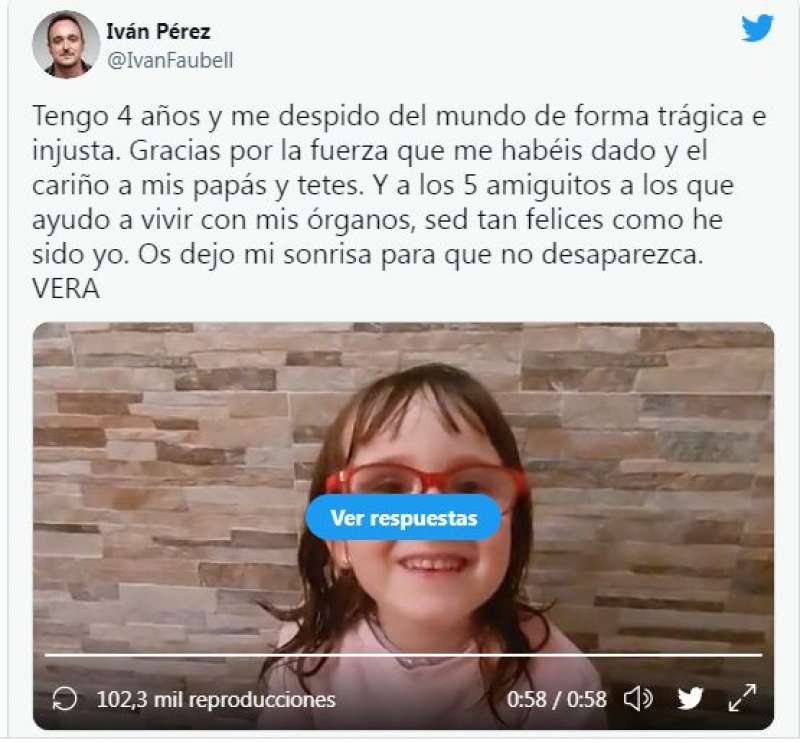 "Tengo 4 años y me despido del mundo de forma trágica e injusta. Gracias por la fuerza que me habéis dado y el cariño a mis papás y tetes. Y a los 5 amiguitos a los que ayudo a vivir con mis órganos, sed tan felices como he sido yo. Os dejo mi sonrisa para que no desaparezca. VERA", recoge el mensaje.