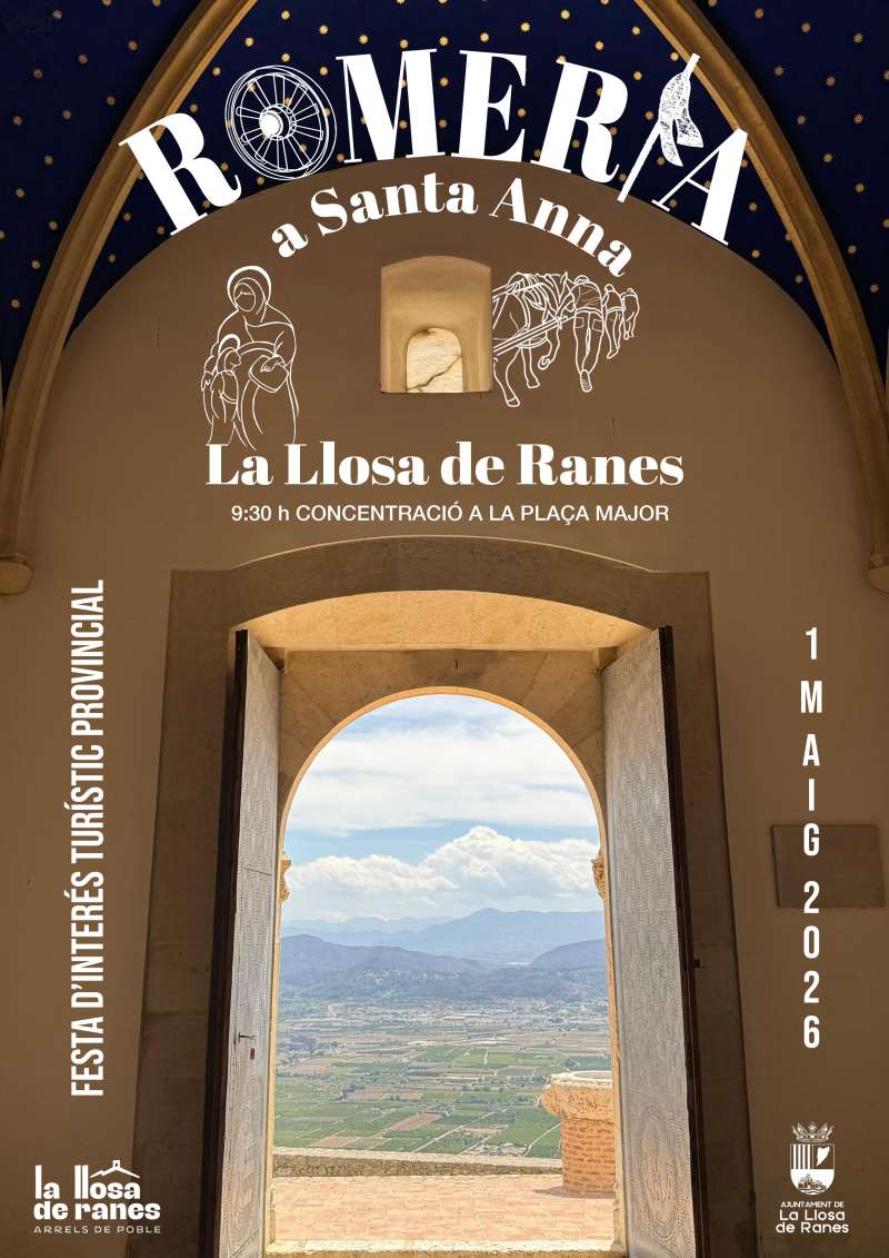 Cartell Romeria 2026./ EPDAAmb l’arribada del mes de maig, La Llosa de Ranes es prepara per a viure una de les seues celebracions més destacades: la Romeria a Santa Anna, que tindrà lloc l’1 de maig i que cada any reuneix centenars de participants entre veïns i visitants. Esta festa, reconeguda com a Festa d’Interés Turístic Provincial des de 2024, destaca pel seu fort arrelament i pel seu ambient de convivència.