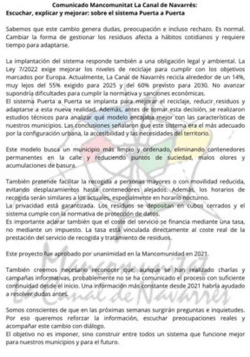 Comunicado Mancomunidad La Canal de Navarrés./ EPDAEl debate en torno al sistema de recogida de residuos