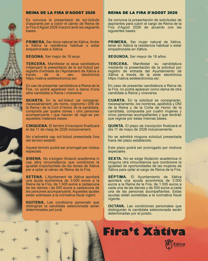 En este context, l’Ajuntament ha obert el termini de presentació de candidatures per a optar a Reina de la Fira 2026, que estarà actiu fins a l’11 de maig. Com a principal novetat d’esta edició, les persones acompanyants de la Reina i la Cort d’Honor rebran una ajuda econòmica de 500 euros.