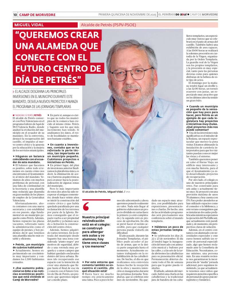 'Líderes de Aquí' de la 99.9 Valencia Radio, donde analizó la evolución del municipio en el ecuador de su mandato. En la entrevista, destacó la recuperación del castillo, el impulso al nuevo centro cívico y la apuesta por la educación y la mejora de los servicios municipales.