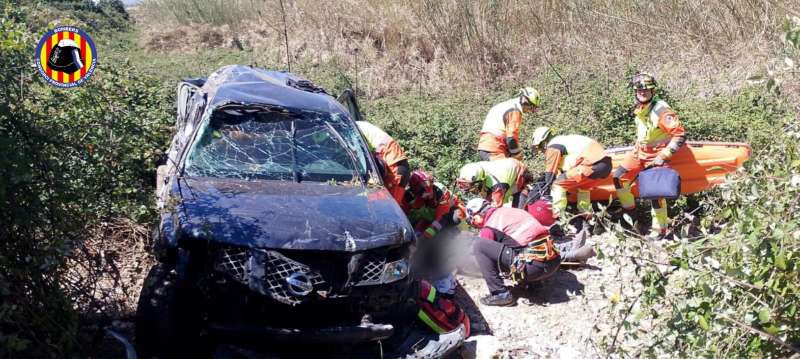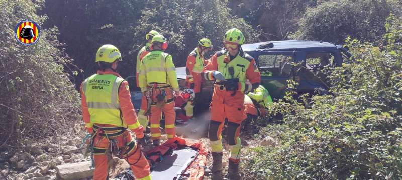 El Consorci de Bombers de València mobilitza el grup GERA i helicòpter per extreure el vehicle d'un barranc i traslladar el conductor als serveis sanitaris