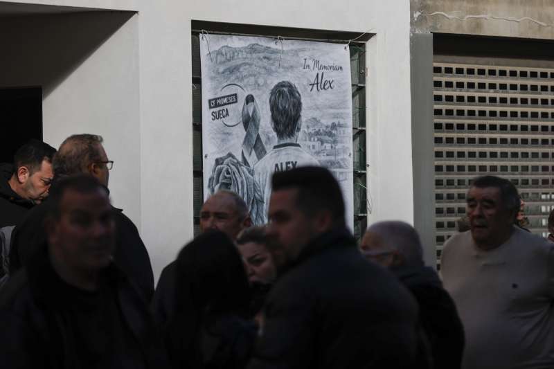 Varias personas aguardan junto a un cartel en memoria de la víctima al pase a disposición judicial del hombre de 48 años que se entregó el pasado sábado en el cuartel de la localidad valenciana de Sueca y confesó haber matado a un menor de 13 años con el que jugaba su hijo en la vivienda familiar. EFE/Manuel Bruque
