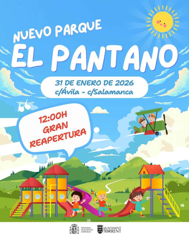 Cartel de la inauguración del parque. / EPDAEl Ayuntamiento de Torrent reabrirá el próximo sábado 31 de enero a las 12:00 horas, el parque infantil de la Urbanización El Pantano ubicado en las calles Salamanca y Ávila, tras la finalización de las obras de renovación integral del espacio, una actuación que permitirá devolver a los vecinos un área de juego muy esperada y especialmente necesaria tras los daños sufridos por la dana.