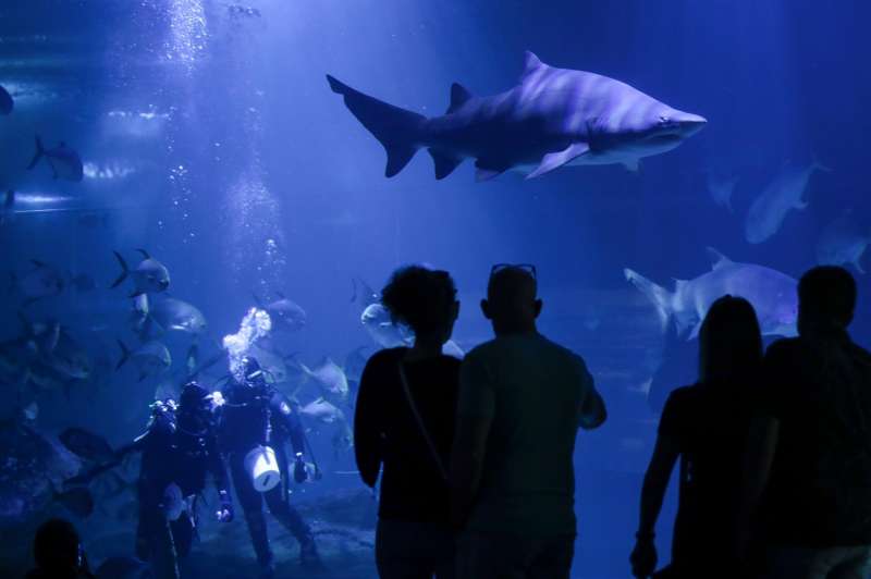 Varias personas contemplan un tiburón en las instalaciones del Oceanográfic donde este jueves se ha inaugurado el congreso internacional sobre estos animales que por primera vez se celebra en Europa y donde expertos de todo el mundo aportarán durante tres jornadas sus últimas investigaciones y alertas. EFE/Ana EscobarEn el marco del