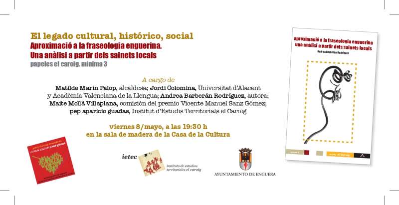 Presentación de la publicación Aproximació a la fraseologia enguerina. Una anàlisi a partir dels sainets locals./ EPDALa Casa de la Cultura de Enguera acogerá el próximo viernes 8 de mayo, a las 19:30 horas, la presentación de la publicación Aproximació a la fraseologia enguerina. Una anàlisi a partir dels sainets locals, obra de Andrea Barberán Rodríguez, ganadora del premio de ensayo e investigación Vicente Manuel Sanz Gómez 2026.