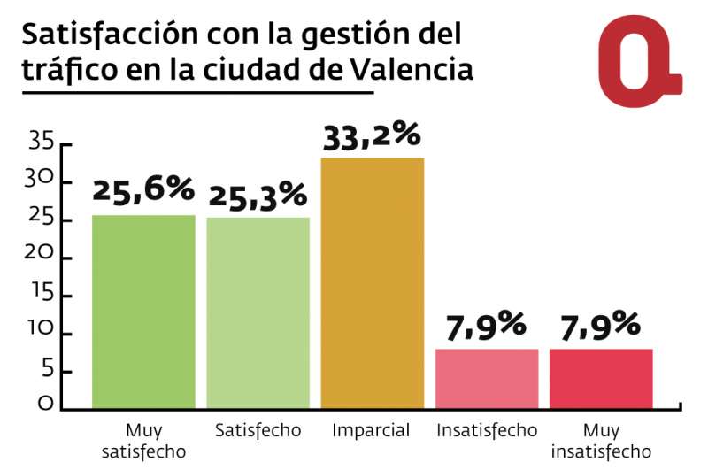 Satisfacción de la gestión del tráfico. / Jaime SorianoLa gestión del tráfico en Valencia recibe una valoración mayoritariamente favorable por parte de la ciudadanía, aunque con un amplio sector que se mantiene en una posición intermedia y una minoría que expresa descontento. Así lo refleja la encuesta elaborada por SyM Consulting en exclusiva para El Periódico de Aquí, que toma el pulso a la opinión de los vecinos acerca de la movilidad urbana y la gestión municipal en esta materia.