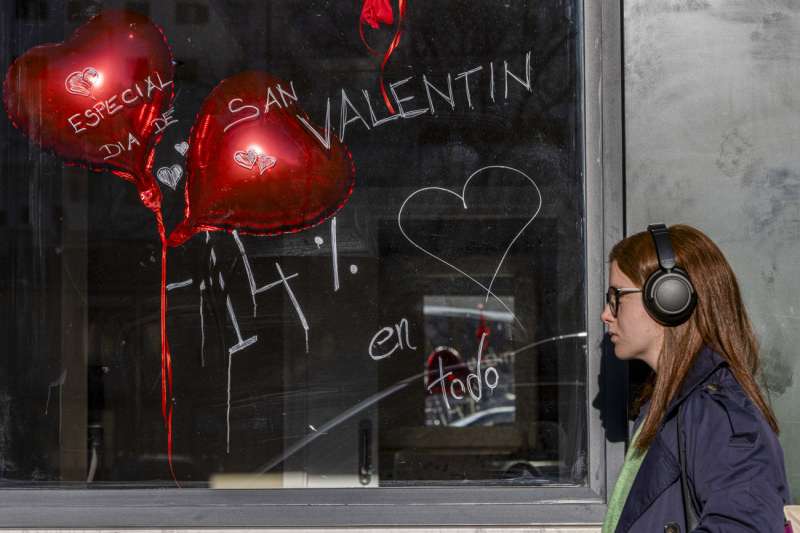 Una joven pasa ante unos adornos con motivo del Día de San Valentín en un escaparate, en una imagen de este viernes. EFE/Cati Cladera